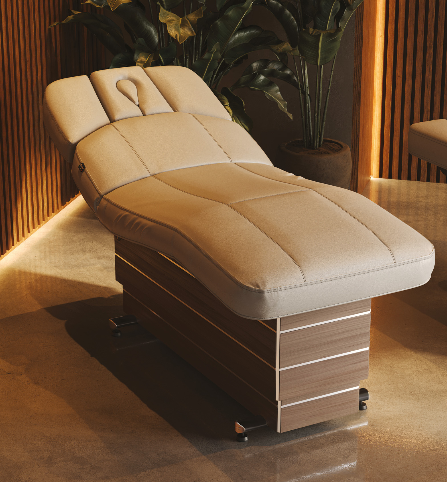 END fonksiyonu: “Tedavinin sonu” konumu, misafirlere tedavinin sonunu belirtmek için sırtlığı yükseltirken masayı minimum yüksekliğe indirme olanağı sunar.